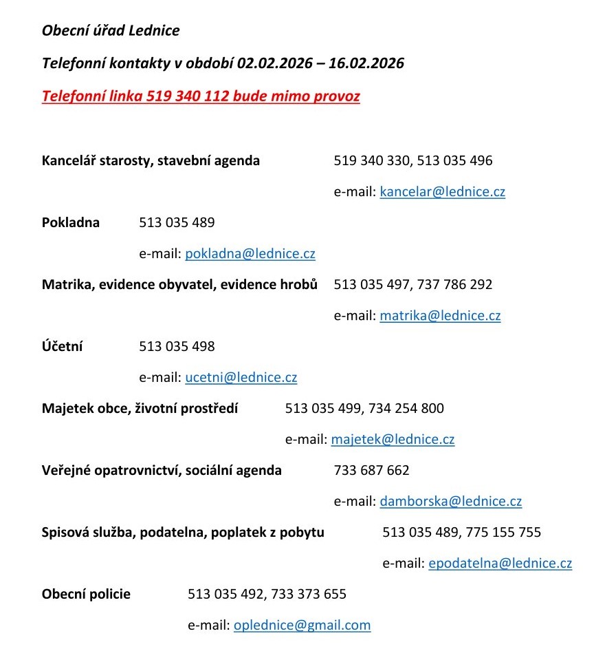 Telefonní kontakty na obecní úřad v Lednici v termínu 02.02.2026 - do odvolání
