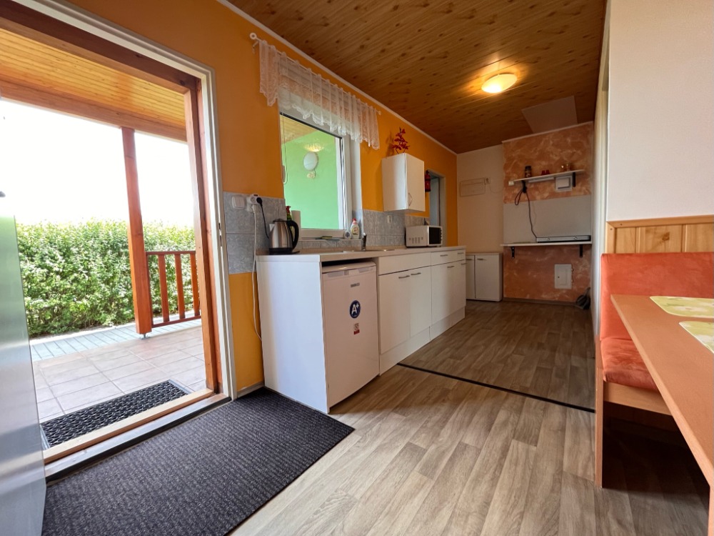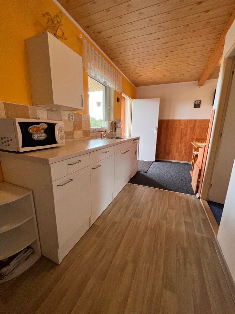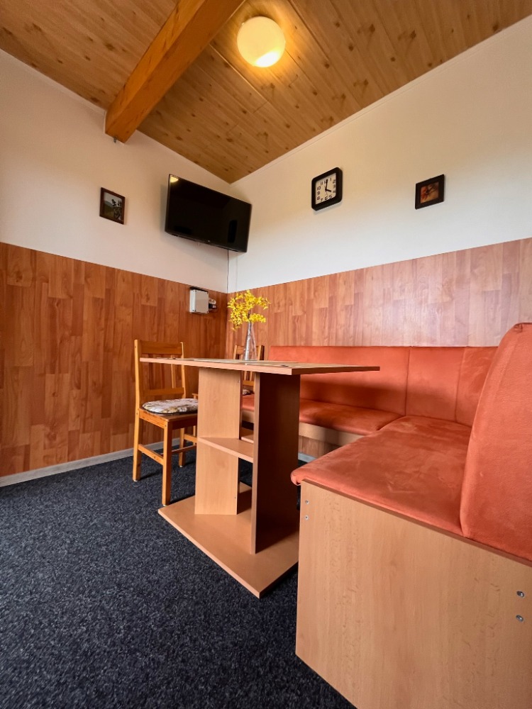 Kuchyňka s jídelním koutem(lednička, dvouplotýnkový vařič, rychlovarná konvice)