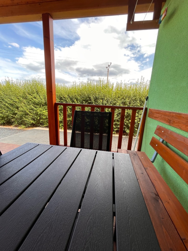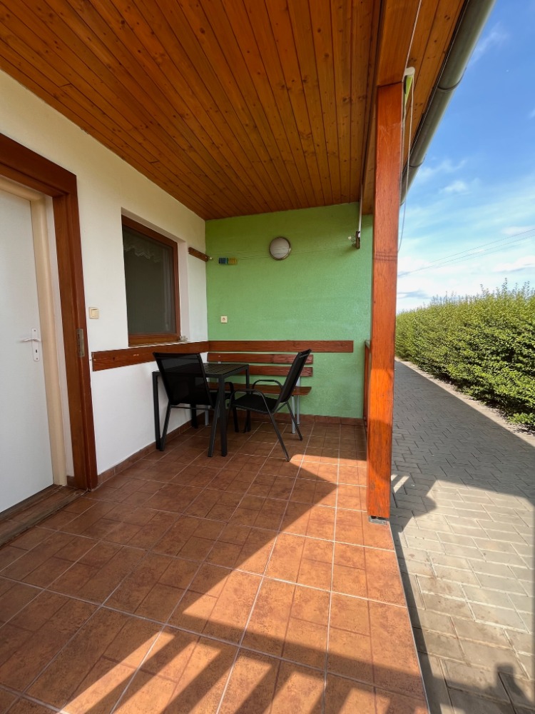 Apartmány mají vlastní vchody se zastřešenou terasou a venkovním posezením.