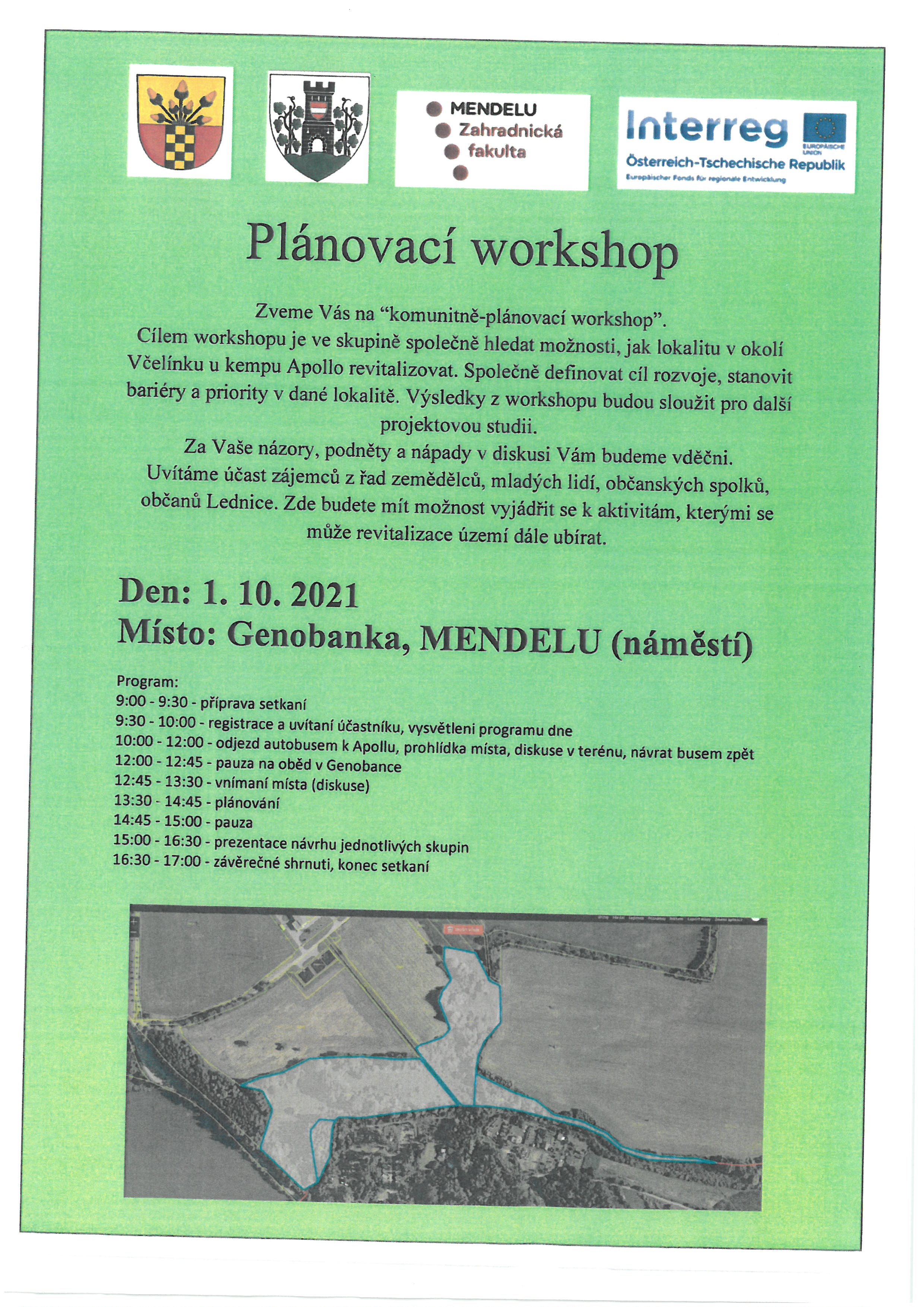 Zveme Vás na "komunitně - plánovací" workshop, který se bude konat 1.10.2021 od 9:00 hod. v Genobance, MENDELU na náměstí.